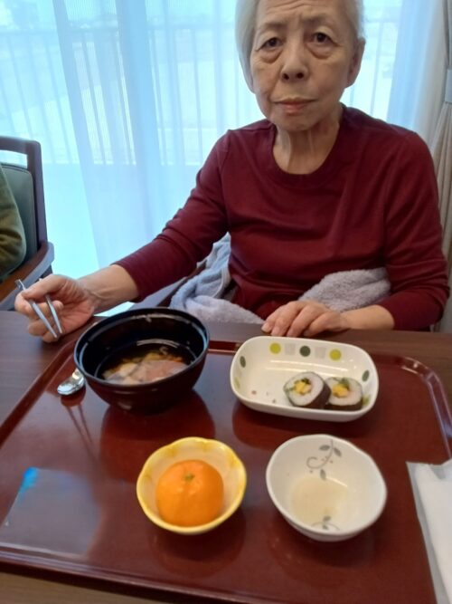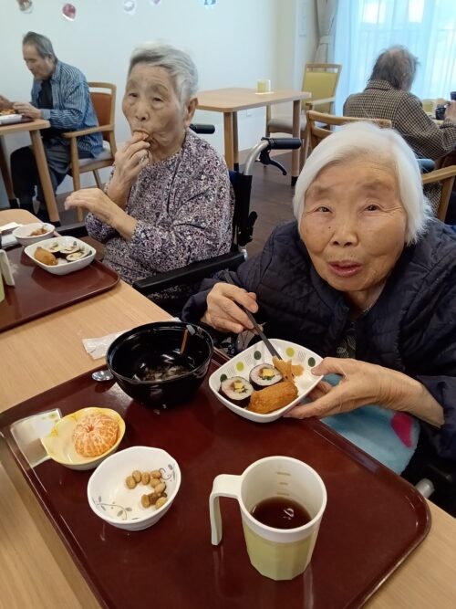 恵方巻・おいなりさん 五目豆・イワシのつみれ汁 みかん